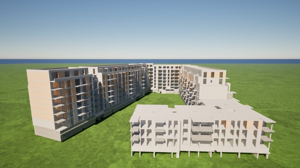 - The vertical structural system consists mainly of reinforced concrete columns with typical dimensions of 30 × 60 cm, together with local monolithic walls and precast reinforced concrete perimeter walls. The column grid generally follows a 6 × 6 meter layout, providing efficient spans while maintaining open parking functionality.