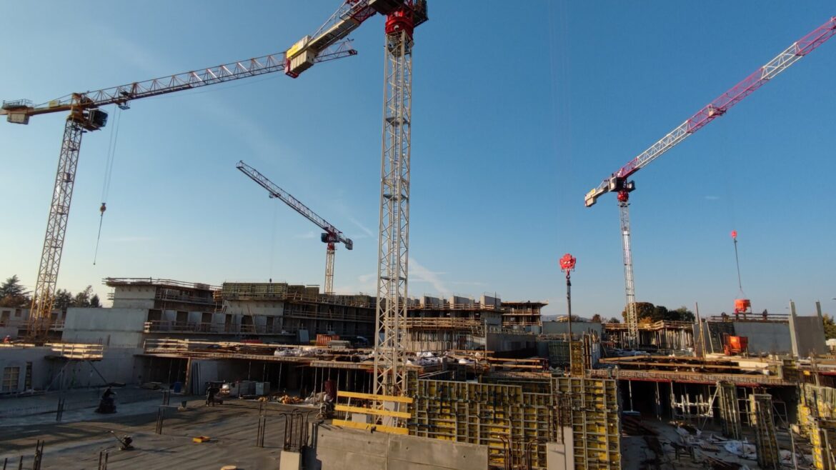 Construction site showing advanced progress with most structural work completed and final activities in progress. Construction Case Study in Graz